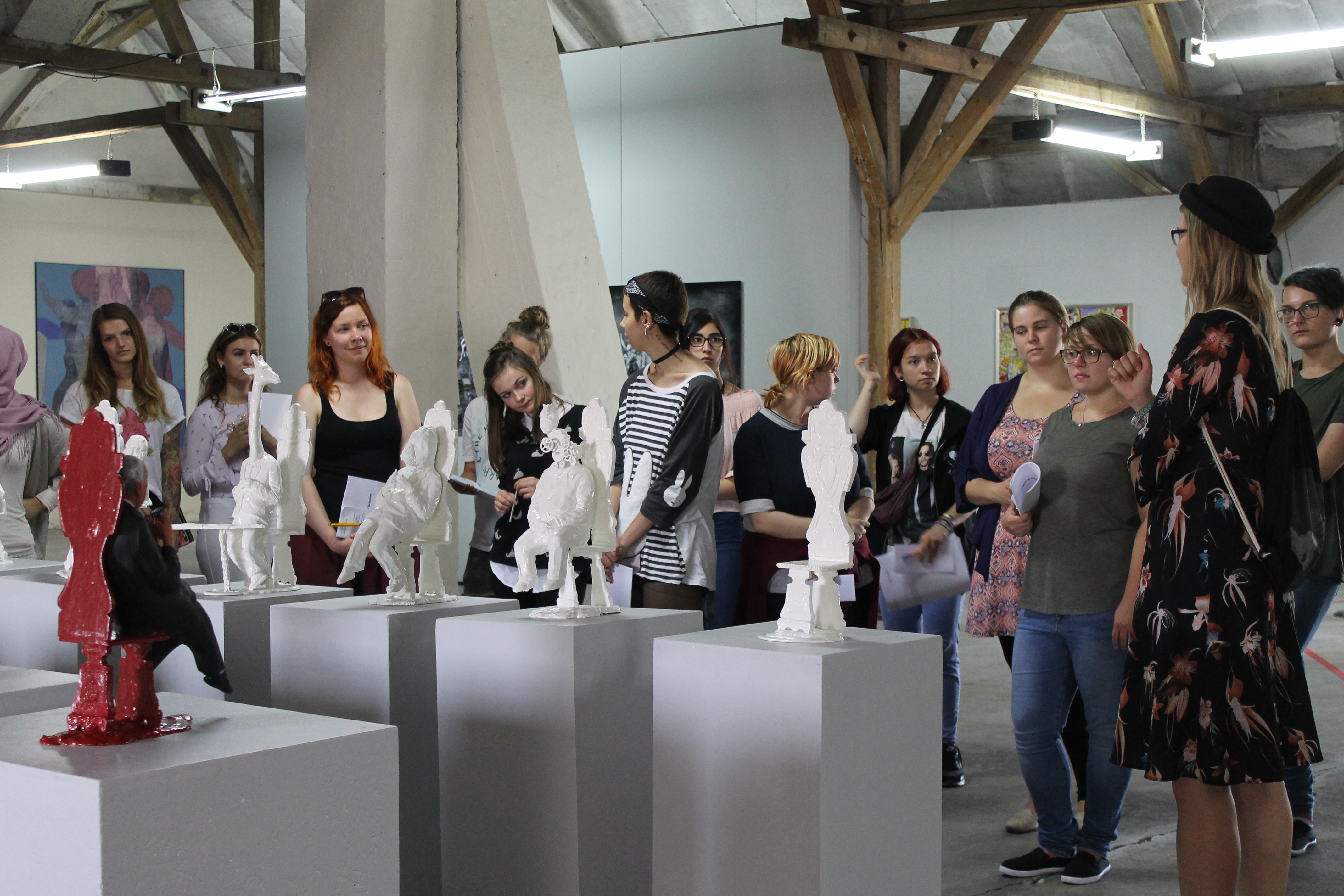 Der Workshop wird von mindestens einer Kunstvermittler*in begleitet, die in der Zeit zwischen Ausarbeitung und Präsentation für Fragen zur Verfügung steht und die Gruppe während der Führung unterstützt.