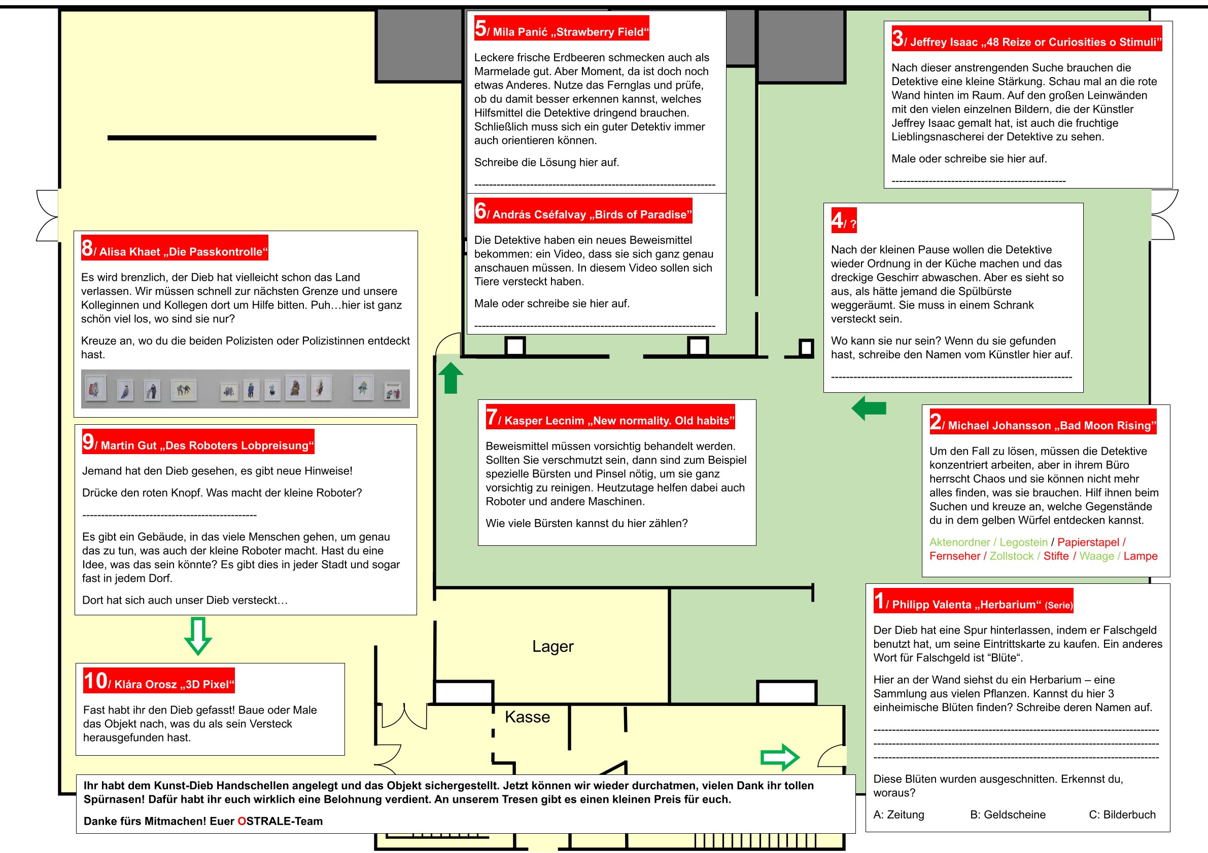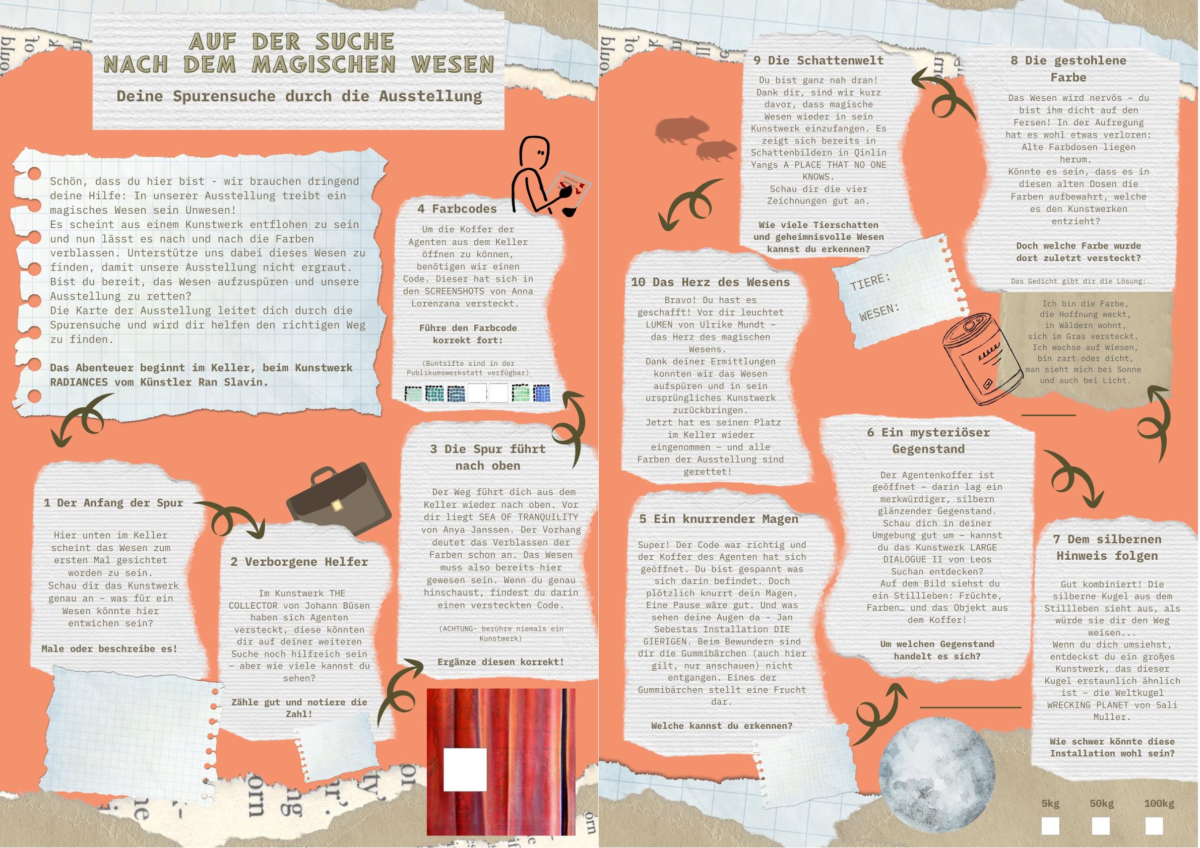 Eine detektivische Ermittlung für Jung und Alt lädt auf eine Spurensuche durch die Welt der Kunst ein. Mit dem Entdeckerspiel wollen wir den jungen Besucher*innen die Ausstellung auf eigene Faust aktiv erleben lassen. Die Spurensuche ermöglicht eine bessere Orientierung in der Ausstellung, eine spannende Erkundung der Kunstwerke sowie das Finden der Antworten auf neugierige Kinderfragen.